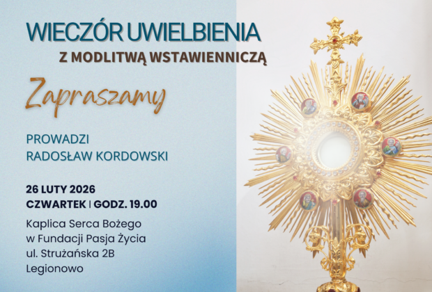 Zapraszamy na Wieczór Uwielbienia! Czekamy na Ciebie 26 lutego o godzinie 19:00 w Fundacji Pasja Życie przy ul. Strużańskiej 2B w Legionowie. Wieczór poprowadzi Radosław Kordowski, ... -